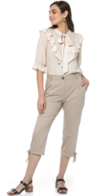 This outfit is perfect for warmer weather or casual office environments. The cropped pants add a playful touch, while the blouse keeps it professional. Complete the look with sandals or loafers.