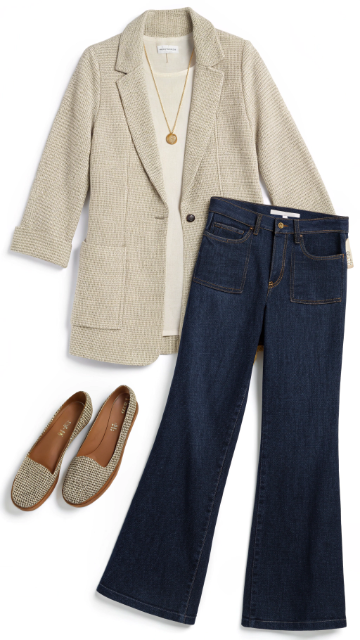 A knit blazer paired with wide-leg jeans is a stylish and comfortable business casual outfit. Choose a blazer in a neutral tone and pair it with dark-wash jeans. Add a simple top underneath.