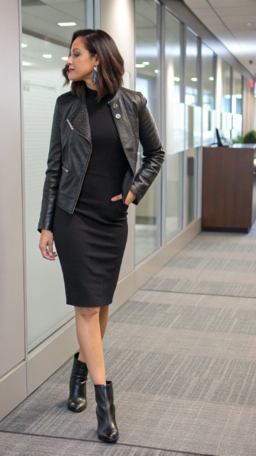 This outfit is perfect for making a bold statement in the office. The sheath dress keeps it professional, while the leather jacket adds attitude. Accessorize with ankle boots or pumps.