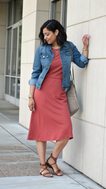 This outfit is great for warmer months or casual office environments. The midi dress adds femininity, while the denim jacket keeps it relaxed. Pair with sandals or flats.