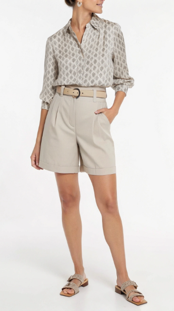 This outfit is perfect for warmer weather or casual office environments. The printed blouse adds interest, while the tailored shorts keep it professional. Pair with sandals or loafers.
