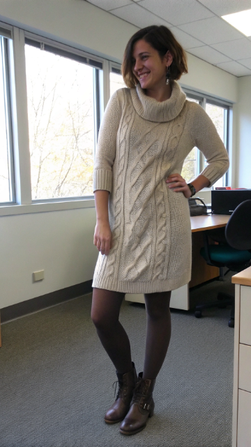 This outfit is perfect for cooler months or casual office environments. The turtleneck dress adds warmth, while the boots keep it polished. Accessorize with minimalist jewelry.