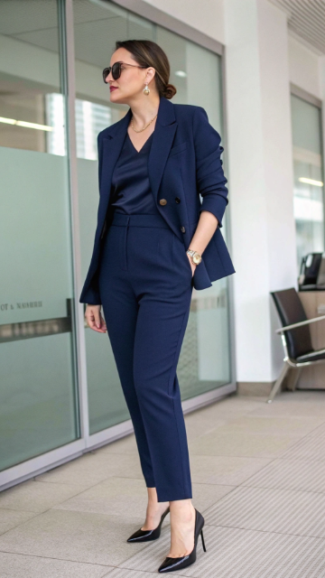 This outfit works well for formal meetings or office presentations. The blazer adds structure, while the slim pants keep the look modern. Finish with pointed-toe heels or loafers for a sleek appearance.