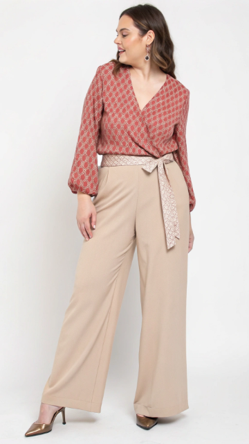 This outfit is great for warmer months or casual office environments. The wrap top adds femininity, while the wide-leg pants keep it modern. Pair with heels or flats.