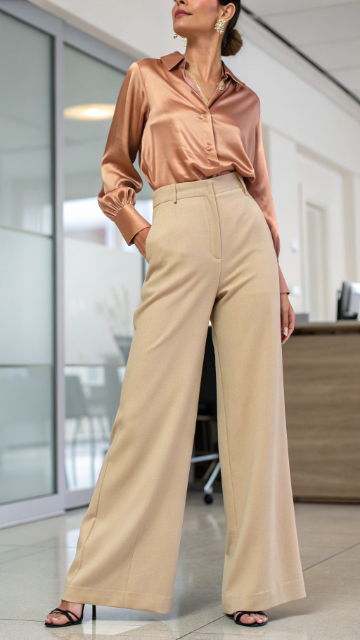 This outfit is perfect for making a statement while staying professional. The wide-leg pants add movement, while the silk blouse brings elegance. Finish with strappy heels or loafers for a polished look.