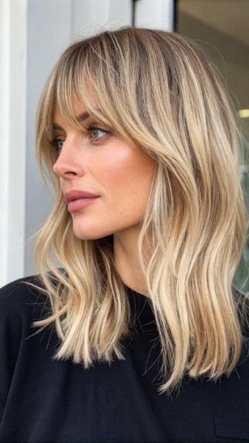 The blunt bangs add a touch of drama and frame the face beautifully. This style works well with straight hair and can be accessorized with headbands or clips. It’s a versatile choice for any occasion.