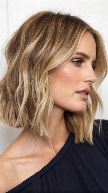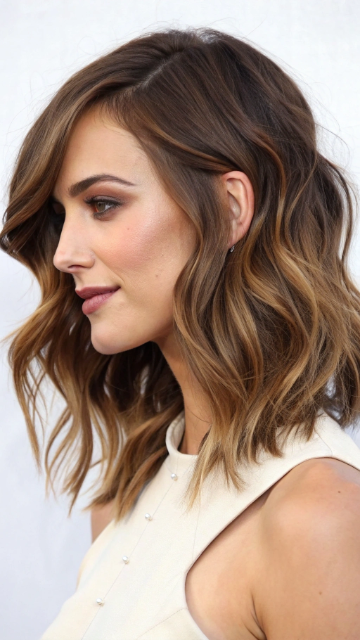 The wavy lob (long bob) with a side part is a chic and versatile hairstyle. This cut features soft waves that add volume and movement to the hair. It’s perfect for those who want a feminine and effortless look.