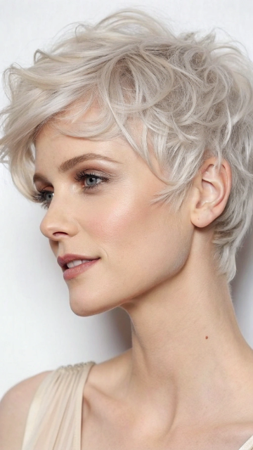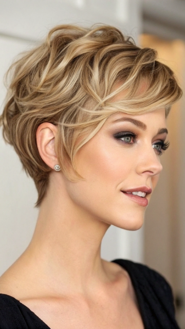 Pair this style with bold makeup or accessories to highlight the contrast. The wavy pixie works well for all hair types and can be styled with or without bangs. It’s a standout choice for anyone looking to make a statement.