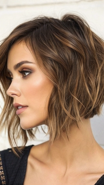 Pair this style with soft waves or curls to enhance the textured effect. The short bob works well for all hair types and can be styled with or without bangs. It’s a versatile choice for any occasion.