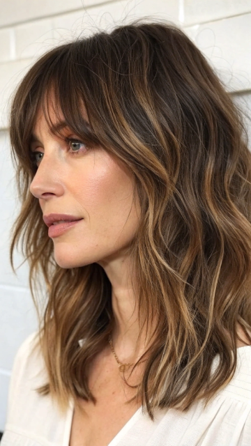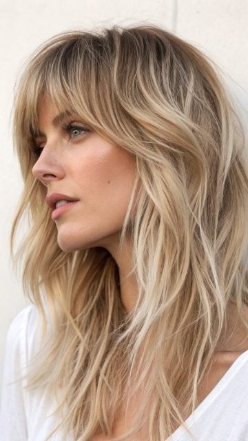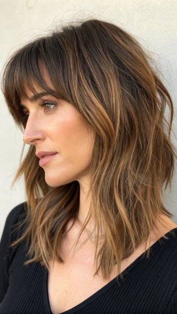 This timeless style features choppy layers and soft, wispy bangs. The layers create volume, while the bangs frame the face beautifully. It’s a versatile cut that works on straight, wavy, or slightly curly hair.