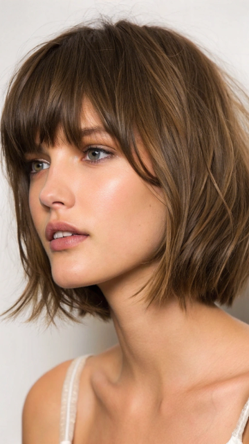 A bob-length shag combines a classic shape with shaggy layers. Baby bangs add a playful, youthful touch to the overall look. This cut is ideal for those who want a short style with personality.