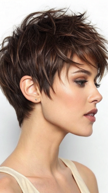 A textured pixie shag is bold and edgy, perfect for short hair lovers. Micro bangs add a playful touch, making this cut stand out. The choppy layers create a tousled, effortless look.