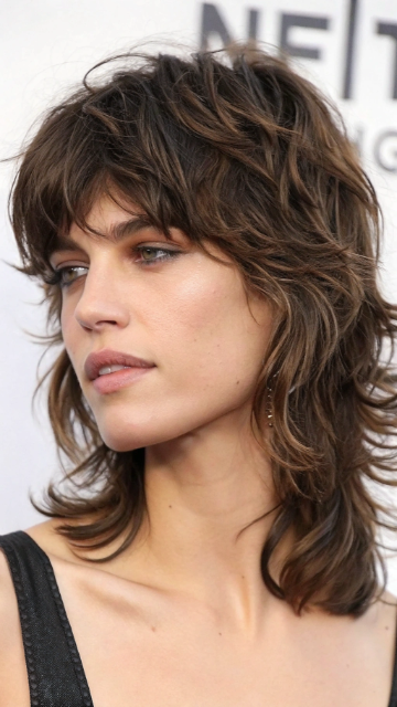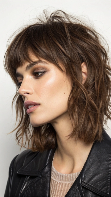 A razor-cut shag has sharp, feathered ends for a rocker-chic vibe. The bangs are wispy and blended seamlessly into the layers. This edgy style works best on straight or slightly wavy hair.