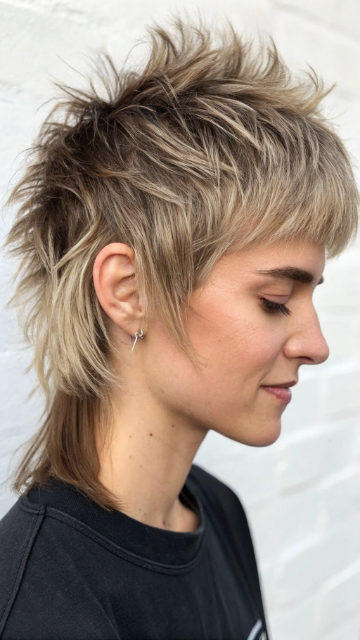 This updated mullet features a shaggy texture with wispy bangs for balance. The short front layers gradually lengthen toward the back for subtle drama. It’s an edgy yet wearable take on the classic mullet shape.