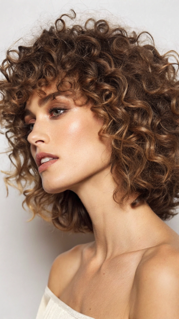 This version embraces natural curls with layered volume and full, blunt bangs. The curls are defined but not overly structured for a playful look. It’s perfect for those with naturally curly or permed hair.