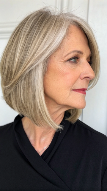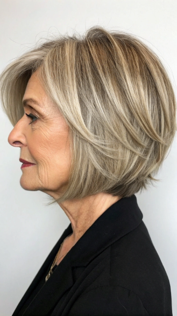 A layered lob (long bob) with a side part is a sophisticated and modern choice for women over 70. The side part adds asymmetry, while the layers create movement and body. This style is perfect for those who want a polished yet effortless look.