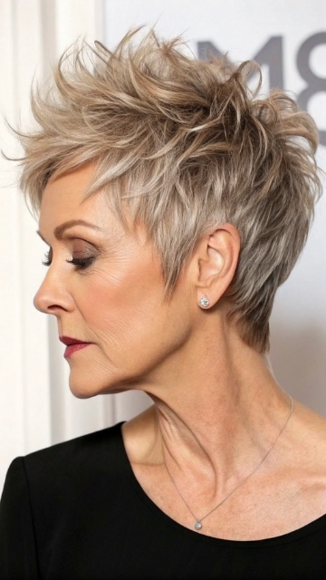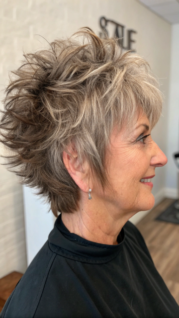 A layered pixie with a tousled top is a bold and modern option for women over 70. The tousled top adds texture and movement, while the short sides create a sleek and edgy look. This style is perfect for those who want a low-maintenance yet stylish haircut.