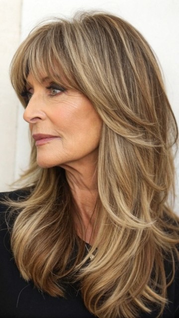 Long layered hair with bangs is a timeless and elegant choice for women over 70. The layers add volume and texture, while the bangs soften your facial features. This style is perfect for those who love a romantic and feminine look.