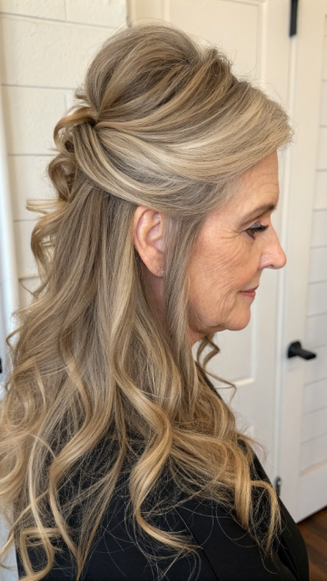 You can style this haircut with a curling iron for defined waves or let it air-dry for a more natural finish. The half-up, half-down style adds a touch of glamour, making it a great choice for special occasions.