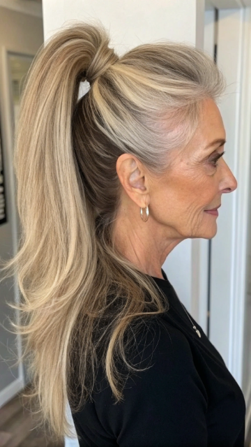 Long layers with a high ponytail are a chic and modern option for women over 70. The layers add movement and body, while the high ponytail creates a sleek and youthful look. This style is perfect for those who want a polished yet effortless appearance.