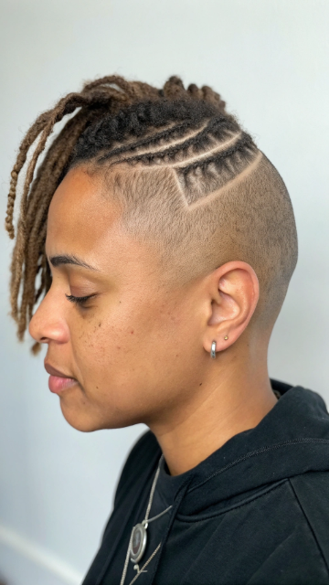 The buzz cut creates a strong contrast with the remaining locs. It works best with thicker locs for a noticeable difference. This cut is perfect for hot weather and active lifestyles.