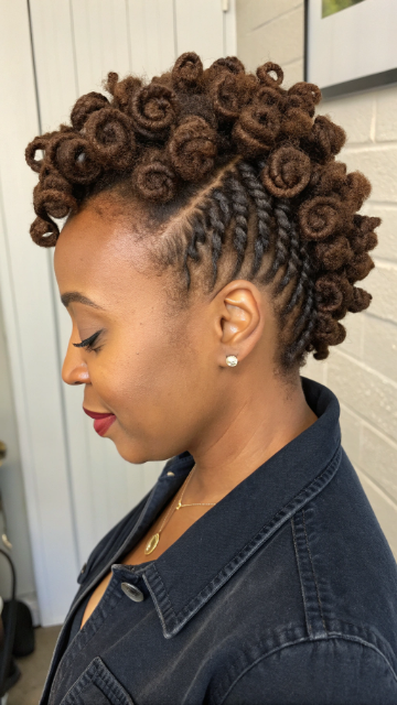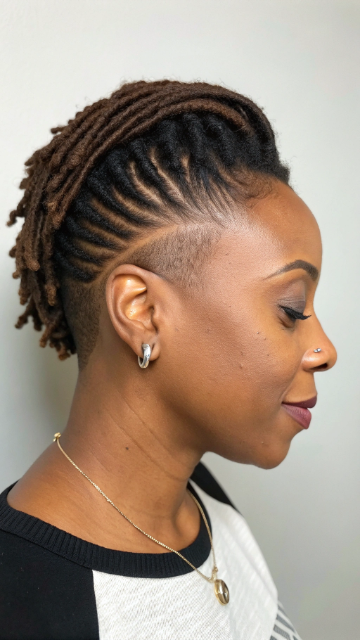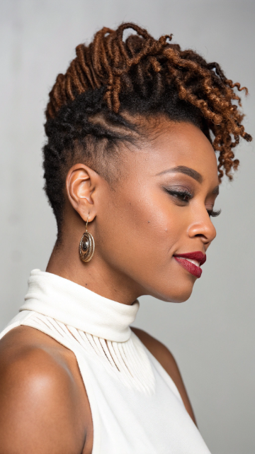 The faux hawk adds height and drama to short locs. It works best with medium-length locs for better styling control. You can use gel or wax to keep the shape intact.