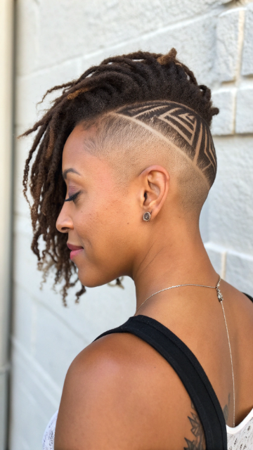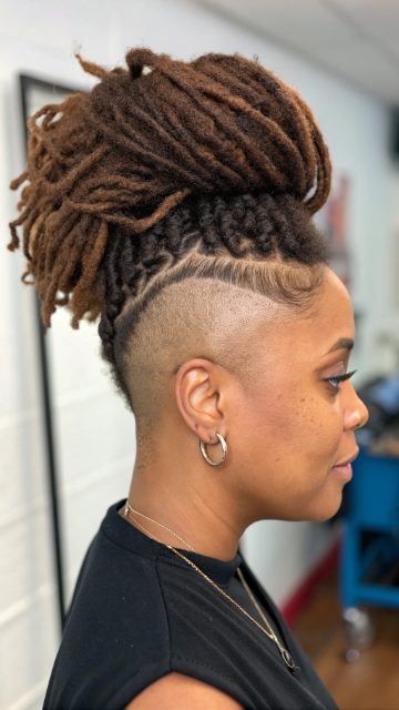 The undercut allows for creative designs or patterns on the shaved areas. It contrasts beautifully with the flowing top locs. This cut is low-maintenance and stays fresh for weeks.