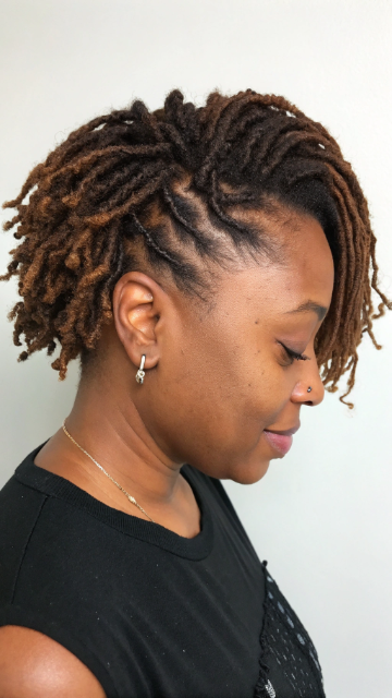 Asymmetrical short locs create an edgy, modern look. One side is slightly longer than the other for an unbalanced yet stylish effect. This cut works well for those who want a bold statement.