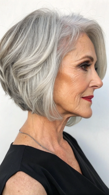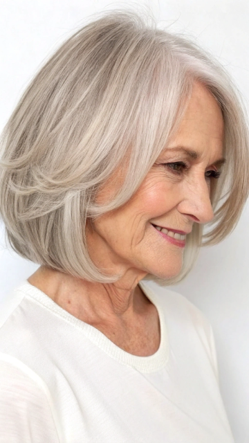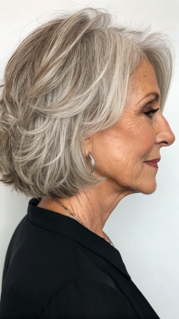 A layered bob is a versatile and stylish option for women over 70. The layers add movement and volume, making your hair appear fuller. This cut suits oval, round, and heart-shaped faces beautifully.