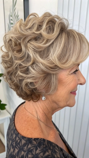 The curly shag is a playful and stylish choice for women over 70 with natural curls. It’s short, bouncy, and full of life. This cut enhances your curls and adds volume to your look.