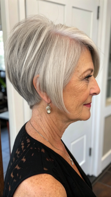 The angled bob is a bold and modern choice for women over 70. It features a sharp angle, with the front longer than the back. This cut adds drama and sophistication to your look.