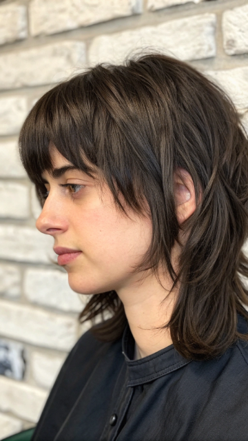 This version features sharp, blunt ends and thick curtain bangs. The heavy bangs make a statement while the wolf cut adds dimension. It’s ideal for those who love a bold, structured look.