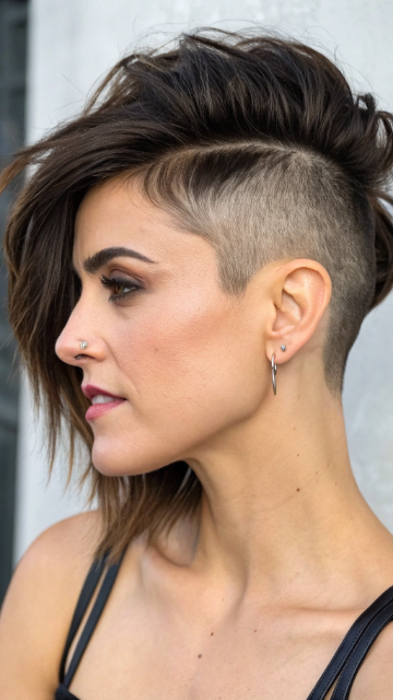 This daring style combines a hidden undercut with a full wolf cut on top. The curtain bangs soften the edgy contrast between shaved sides and voluminous layers. It’s perfect for those who want maximum texture with a rebellious touch.
