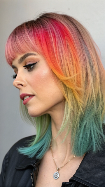 The layers create natural dimension in the color application. Face-framing highlights emphasize the curtain bang effect. This style works with any color from pastels to neons.