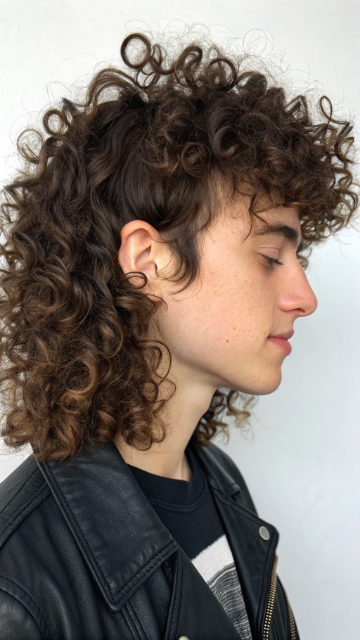 This version adapts the wolf cut for naturally curly textures. The curtain bangs are cut dry to ensure they fall perfectly with the curl pattern. It creates amazing volume and shape for curly-haired folks.